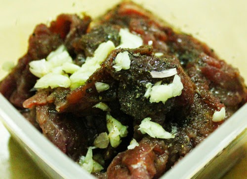 Bước 1: Đập dập, lột vỏ, băm nhuyễn 1 tép tỏi. Rửa sạch, thái lát mỏng thịt bò. Ướp thịt bò với 15ml dầu mè, 10g đường, 20ml nước tương, 20ml rượu trắng.