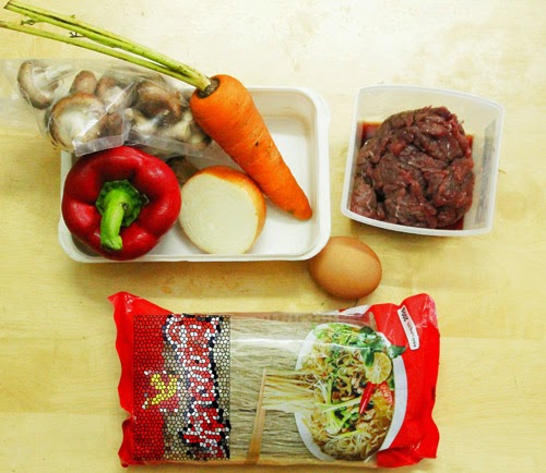 Bước 6: Vẫn chảo vừa xào miến, cho hành tây vào, mở lửa vừa và đảo đều. Khi hành tây chuyển trong, tiếp tục thả cà rốt, ớt chuông, nấm đông cô và thịt bò vào xào. Nêm 10g đường, 20ml nước tương, 3g ớt bột, nấu thêm 2 phút nữa rồi tắt bếp.