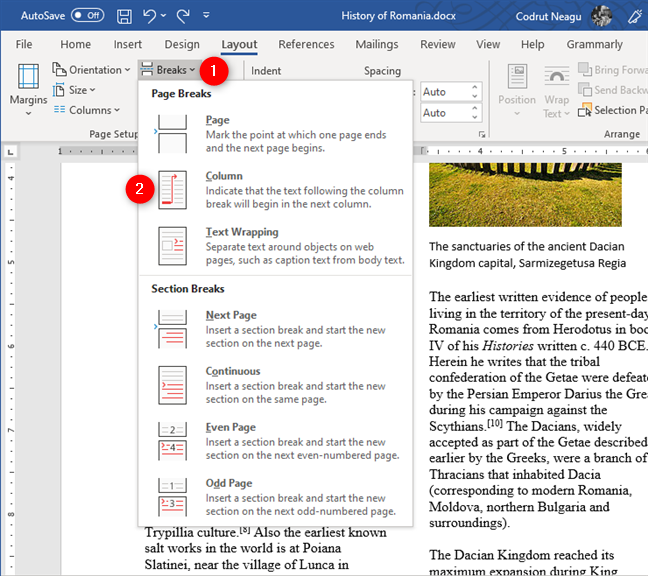 Bước 3: Trong phần Page Setup từ tab Layout , bấm hoặc chạm vào Dấu ngắt . Hành động này hiển thị danh sách các tùy chọn bố cục cho Page Breaks và Section Breaks . Trong đó, nhấp hoặc nhấn vào Column .