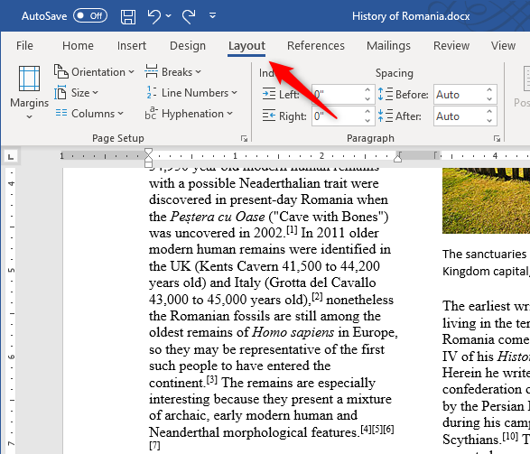Bước 2: Sau đó, bấm hoặc chạm vào tab Layout từ giao diện trên thanh công cụ trong Microsoft Word.