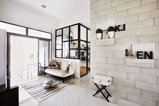 Không gian của chung cư rất hạn chế sử dụng các bức tường làm vạch ngăn. Không gian giữa phòng khách và phòng học được cách biệt bởi vách kính trong. Điều này giúp phòng sách nhận được rất nhiều ánh sáng tự nhiên và không cách biệt hoàn toàn với không gian trong nhà.