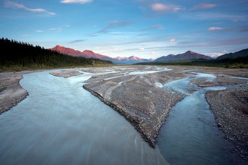 Dòng Teklanika, một nhánh của sông Yukon, hoang dã trôi xuyên suốt công viên quốc gia Denali. Sự ngoằn ngoèo uốn lượn của nó tạo ra nhiều dạng địa hình xói mòn trong khu vực.