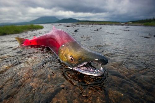Trên ảnh là góc chụp cận cảnh một chú cá hồi đực đang nghỉ ngơi trên một bãi cạn sau khi giao phối. Loài cá này sẽ chết đi ở chính nơi chúng sinh ra, sau khi thực hiện xong ‘nhiệm vụ cao cả’ là duy trì nòi giống.