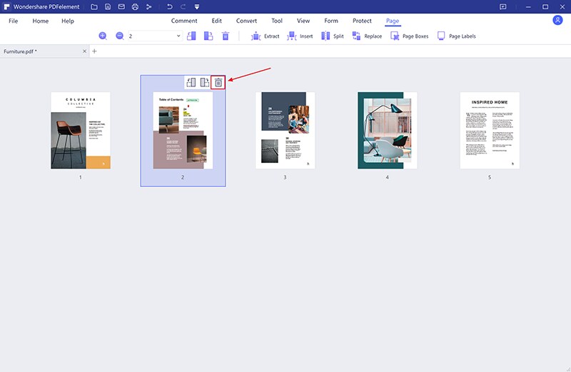 Tệp PDF của bạn bây giờ sẽ xuất hiện trên chương trình. Đi đến phần chính và nhấp vào tùy chọn "Trang". Từ đó, bạn sẽ thấy danh sách các tùy chọn tùy chỉnh trang. Nhấp vào tùy chọn cuối cùng là các trang đã bị xóa. Bây giờ đi đến trang mà bạn muốn xóa và nhấp vào biểu tượng xóa. PDFelement sẽ xóa vĩnh viễn các trang khi lưu các thay đổi.