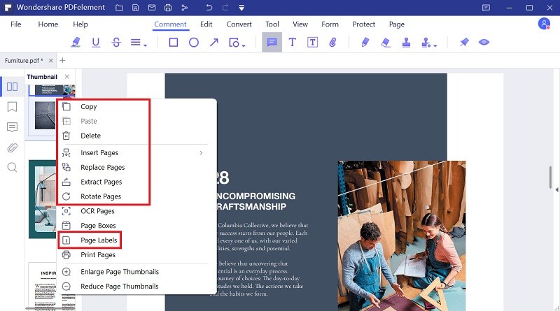 Bây giờ, khi các tệp PDF xuất hiện trên màn hình, hãy nhấp vào hình thu nhỏ của nó. Các hình thu nhỏ có sẵn trên thanh menu bên trái. Khi hình thu nhỏ của tệp PDF xuất hiện, bây giờ bạn có thể cuộn qua tài liệu và nhấp chuột phải vào trang bạn muốn xóa. Chọn tùy chọn "Delete" từ menu thả xuống và PDFelement sẽ xóa các trang PDF.