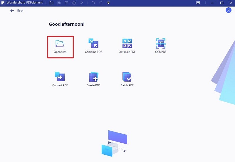 Khởi chạy phần mềm PDFelement được cài đặt trên máy tính của bạn và nhấp vào "Open files". Tiếp theo, duyệt qua các tệp trên máy tính của bạn, chọn file PDF bạn muốn xóa trang và tải nó lên PDFelement. Ngoài ra, bạn có thể kéo và thả tệp PDF vào chương trình.