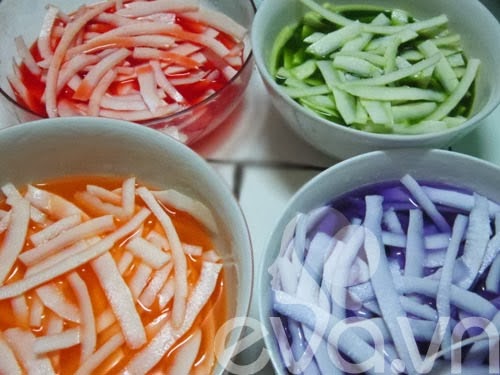 Bước 4: Chia dừa thành 5 phần, cho từng phần vào các bát nước rau củ đã chuẩn bị ở bước 2 và 3 để ướp trong khoảng 4-5 tiếng cho dừa ngấm màu của nước rau củ.