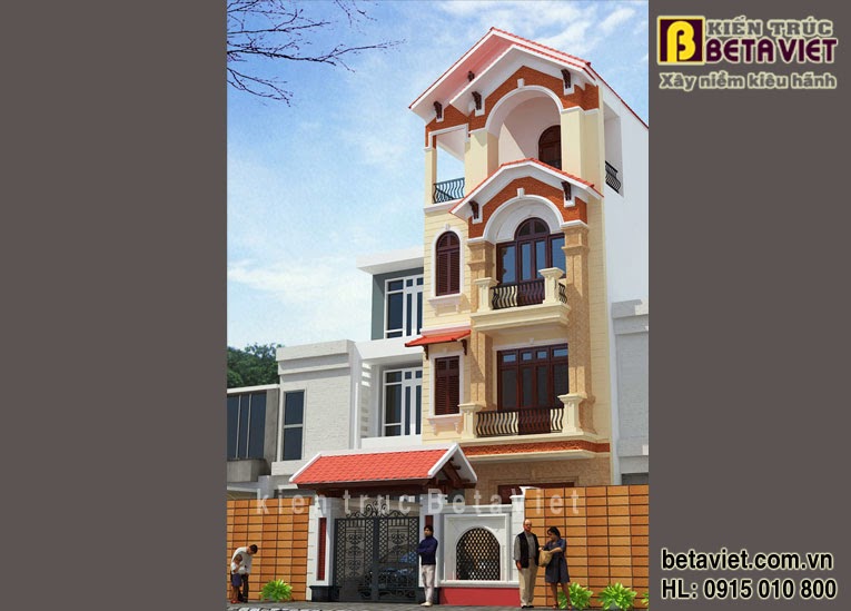 Mẫu thiết kế nhà ống đẹp 3 tầng NO13325 được thiết kế được thiết kế trên mảnh đất có mặt tiền hẹp, 3 mặt đều sát vách với hàng xóm nên chỉ sử dụng mặt tiền để trang trí chính vì vậy mẫu thiết kế nhà NO13325 thường được áp dụng cho những ngôi nhà lô phố. Để ngôi nhà trởi nên nổi bật, ấn tượng các kiến trúc sư của Beta Việt đã nghiên cứu thiết kế ngôi nhà theo phong cách bán biệt thự. Căn nhà sử dụng những hình khối vuông vức, kèm tho đó là những chi tiết theo phong cách kiến trúc pháp mang lại cho ngôi nhà có điểm nổi bật riêng biệt. Trong ánh nắng vàng của nắng cùng với sắc sơn tường, kết hợp đá ốp vân thạch chắc chắn tạo nên " điểm nhấn " tiêu biểu cũng như vẻ sang trọng trong không gian cảnh quan đô thị.